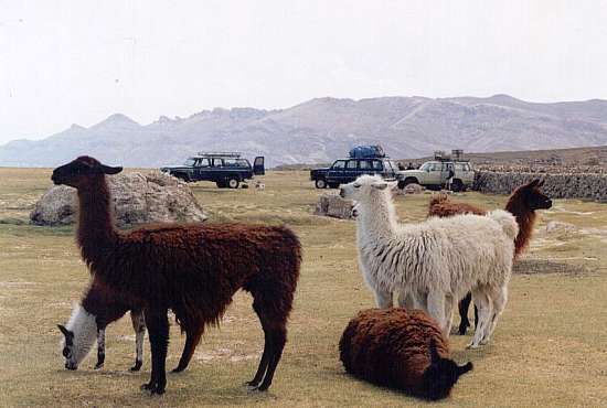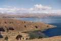 Aan de andere zijde van het meer worden we begroet door lama's. | ![]() |