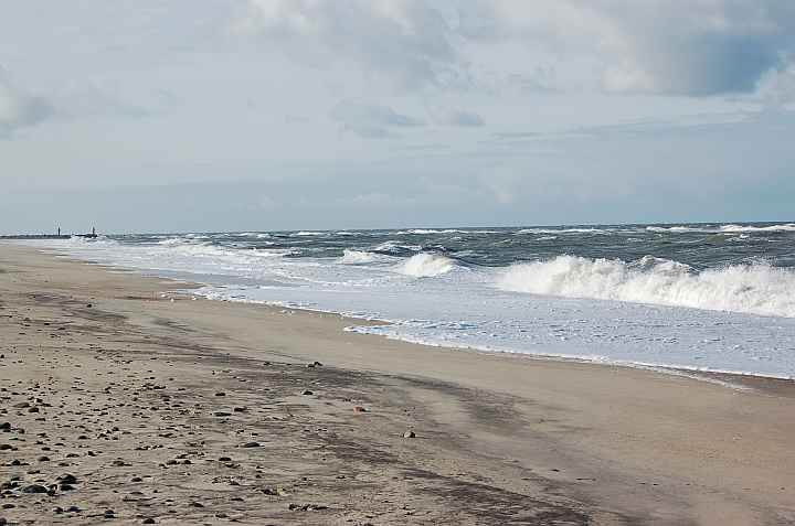 In het centrum van Hvide Sande tanken we 65 liter bij. Daarmee kunnen we op weg richting Løkken. Even na Thorsminde stoppen we (op een dam tussen de zee en het Nissum Fjord), en klauteren we twee duinenrijen over om met de neus pal in de wind een woeste zee te aanschouwen.
