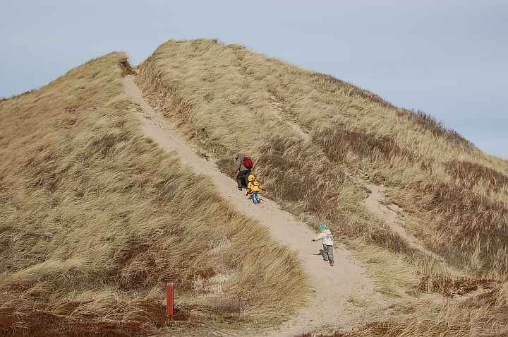 Via een zandweg bereiken we Lodbjerg Fyr (vuurturen). Hier kan je voor 10 kronen naar boven klimmen voor een 360° uitzicht over het Thy natuurgebied. Na de wandeling (6 km) naar de hoogste duin in de buurt (veel wind en stuifzand) moeten we raadspelletjes verzinnen om de kinderen af te leiden. Xander heeft genoeg zand, strand en wind gehad... Bij terugkeer wacht wel een lekkere beker (warme) groentesoep.