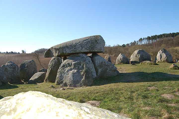Eerst rijden we langs de kust naar Knebel en bezoeken het Deens mini-Stonehenge: Poskær Stenhus. Een vermoedelijke grafheuvel die versterkt werd door een kring van stenen/dolmen. De grafkamer zelf bestond ook uit op elkaar gestapelde stenen met een deksteen van 12 ton (3300 v. Chr.) De andere helft van de deksteen ligt op een grafheuvel 2 km verder op. Omdat het zand ondertussen verdwenen is, kan je duidelijk de structuur van het bouwwerk zien. Nabij de parking vertrekt er een pad naar Thinghulen, maar als we na lang zoeken daar aankomen, is het 25m diepe gat toch iets minder imposant dan beschreven in de Inside Guide (het is inderdaad een gat in de grond, en de hoogste wand zal 25m zijn, maar ondertussen is alles stilaan aan het dichtgroeien). De wandeling en omgeving maken alles goed.