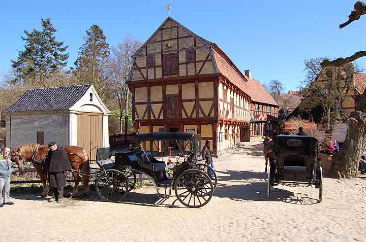 Na de wandeling (11u30) rijden we door naar Århus (2e grootste stad van Denemarken). Meer bepaald Den Gamle By (De Oude Stad). Een soort Bokrijk, maar dan midden in de stad, waarbij oude huizen van over heel Denemarken werden en worden verplaatst om hier bijgezet te worden. Het is een mooie setting (ook met de moderne stad op de achtergrond), en je krijgt hier veel uitleg via de infoborden. Natuurlijk hadden wij al een en ander in het echt gezien, maar hier kan je ook de interieurs bewonderen. Omdat het paasweekend is, zijn er zowat in elk huisje mensen bezig in traditionele klederdracht. In de verschillende huizen zijn collecties te bewonderen van onder andere speelgoed, ...