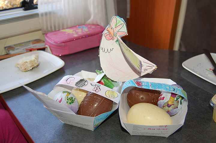 7u : het is Pasen en als we buiten kijken... ligt er sneeuw (en ook een paar paaseitjes)!! Maar het is minder koud (er staat geen wind). De kinderen zijn blij met de chocolade eieren en een nieuw spellenboekje. Ze gaan meteen aan de slag. Na het ontbijt bellen ze naar oma en opa.