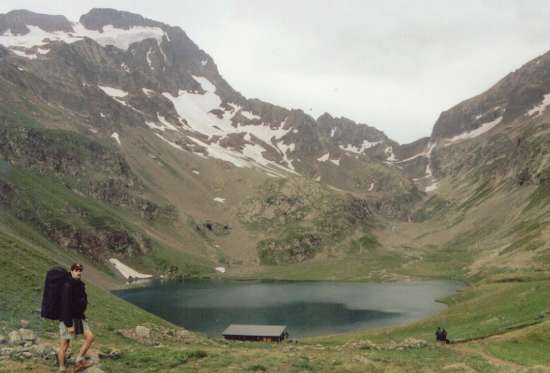 Aankomst aan de eerste hut (aan het Lac de Muzelle). op de achtergrond ligt Col de la Muzelle. |