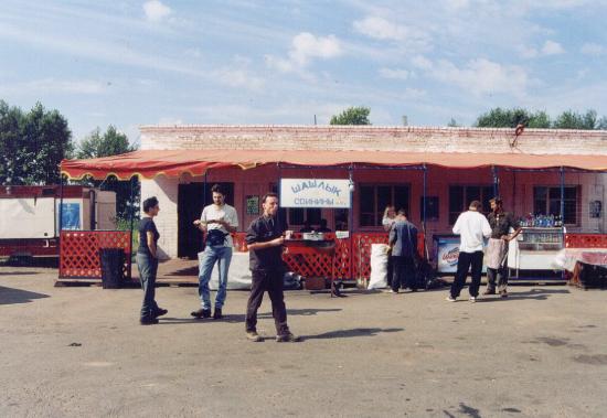 Onderweg wordt er tweemaal aan enkele kraampjes gestopt, zodat we iets kunnen eten (het is geen Westers eten, maar het smaakt wel). Er wordt ook wat drank en fruit aangekocht voor onderweg. Een stop bij familie van de gids geeft ons ook een kwartiertje om de benen te strekken. Om 19u wordt dan de laatste eindsprint van 100km ingezet naar Тюнгур [Tyungur = "sjamanen-trom"].