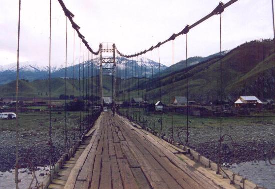 Om 20u30 wandelen we in groep over de enorme hangbrug (over de Катунь [Katun]) die ons naar het basiskamp Высотник-1 [Visotnik] brengt (hoogte 840m). Hier slapen we in kamers van 4а5 personen. En de verdeling volgt de Russische tradities: mannen en vrouwen apart. Naast ons in de hut liggen enkele Japanners. De toiletten worden onmiddellijk getest... hier kan je toch al zitten, al is het op een houten plank.