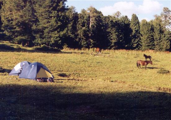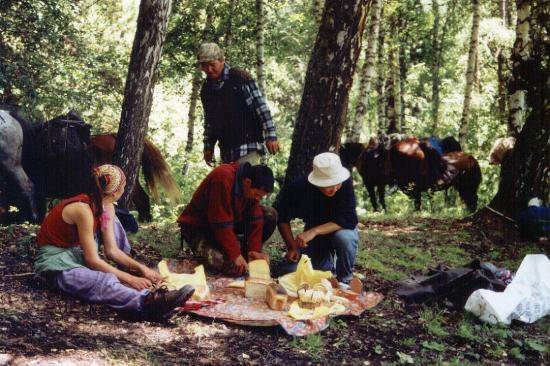 De paarden (met het eten en de bagage) -- onder begeleiding van Ivan en Sascha -- lopen ons reeds voorbij. Tegen 13u houden we een middagpauze aan een klein bronnetje. Brood, kaas, ham-worst en chocolade gaan er vlot in.