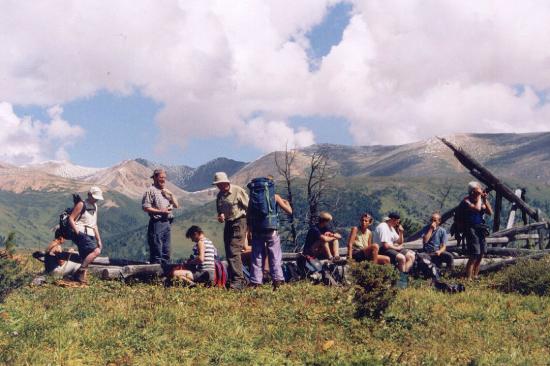 Tegen 8u30 brandt de zon ons uit de tenten. Het ontbijt bestaat uit pap en brood met kaas. Nadat alle tenten zijn afgebroken, vertrekken de paarden via de kortste weg naar beneden. Wij (en 1 paard met eten) wandelen naar het hoogste topje van de Байда [Bajda]-berg (2070m). Enkele jaren geleden brandde de top af en dat is er nog steeds aan te zien. Het zal nog wel enkele jaren duren vooraleer hier weer volgroeide bomen staan...