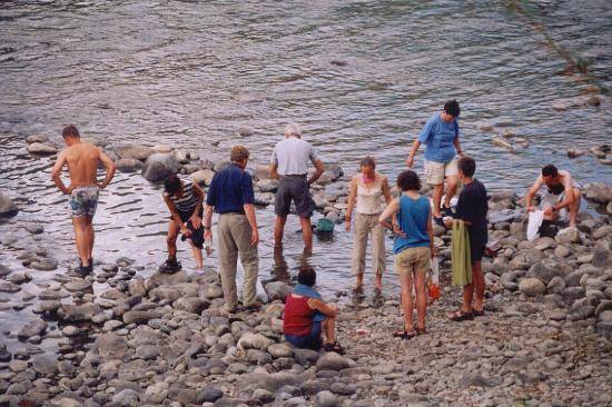 Hierna gaat het recht omlaag, door de bloemenweiden, tot we de picknickplaats van gisteren opnieuw bereiken. Het is bijna een déja-vu: de picknick is identiek, enkel het vlees is vervangen door sardientjes. In een brandende zon gaat het verder over hetzelfde pad richting Тюнгур [Tyungur]. Maar nu weten we al waar we aan bier kunnen geraken. Bij de kruidenier ... en opnieuw komt er een dronken persoon met ons ‘babbelen’. Maar zelfs dan verstaan we niets van dat Russisch. Miet wil ook nog in het tweede winkeltje een stop houden, maar hier is het bier al uitverkocht (tja, die Belgen van twee dagen geleden ook...).