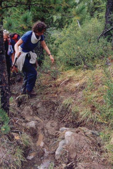 Tegen 9u30 zijn we op weg voor een steile, lange en modderige klim naar "yellow noon". Als we boven de boomgrens even achterom kijken, hebben we een prachtig zicht op de Текелю [Tekelu]-vallei (en de wandeling van gisteren). Boven op de pas (2410m) houden we halt voor de lunch. Aan beide zijden van de kam hebben we een prachtig zicht op de valleien: Текелю [Tekelu] en Akkem.