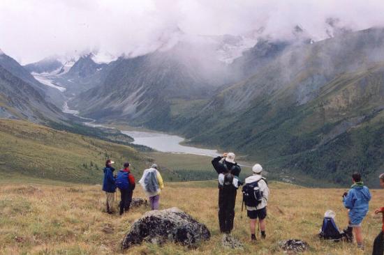 Na een steile maar korte afdaling volgen we de flank van de helling, op weg naar de Ярлу [Yarlu]-vallei (ook wel UFO-vallei genoemd). Het pad loopt aanvankelijk vrij vlak, maar de regen maakt de moerassige ondergrond nog drassiger. We moeten soms van het ene grassprietje naar het andere springen om geen (al te) natte voeten te krijgen. Vlak voor de zeer steile afdaling naar de rivier hebben we een prachtig zicht op het Akkem-meer ["wit water"] en de achterliggende besneeuwde bergen. Op de helling komt zelfs edelweiss voor. Gelukkig zijn er enkele kenners in de groep (die zelfs in de regen nog oplettend rondkijken).