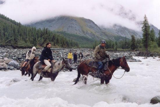 Nog even langs de Ярлу [Yarlu]-rivier wandelen, en dan staan we op 200m van onze kampplaats... alleen kolkt er een aanzwellende gletsjerrivier tussen! Hier daagt Ivan op met de drie paarden. Tim en Dominiek gaan als eersten over. Ondanks de sterke stroming en de rotsige rivierbedding lijkt het best mee te vallen. Maar als na die eerste overtocht het een tijd duurt vooraleer Ivan terugkeert met de paarden, beginnen we ons vragen te stellen. Wanneer Tim dan ook nog met twee bergtouwen opdaagt, worden de vraagtekens nog groter. En als er ten slotte aan elke kant van de rivier iemand met zo’n ‘reddingstouw’ moet gaan staan, begint het angstzweet hier en daar toch wel naar boven te komen...
