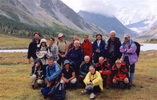 Eerst wandelen we naar het Akkem-meer. Rond het meer is het duidelijk dat dit een echte trekpleister is voor de Russische bergliefhebbers. Er staan hier meer dan 100 tentjes. De ene al wat moderner dan de andere. Er is zelfs een bemand reddingsstation. Achter het meer ligt een prachtig panorama van besneeuwde bergen met als hoogste top гора Белуха [Belukha].