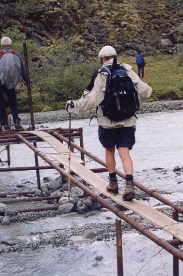 Omdat er opklaringen zijn en het weer mogelijk ’s anderendaags zal verslechteren, beslist Tim om naar de gletsjer te gaan. De eerste hindernis ligt vlak achter het meer. Hier heeft men met een aantal loopplanken en wat stellingen een brug over de Akkem-rivier gemaakt. Eén voor één gaan we over de brug... de een al wat vlotter dan de ander...