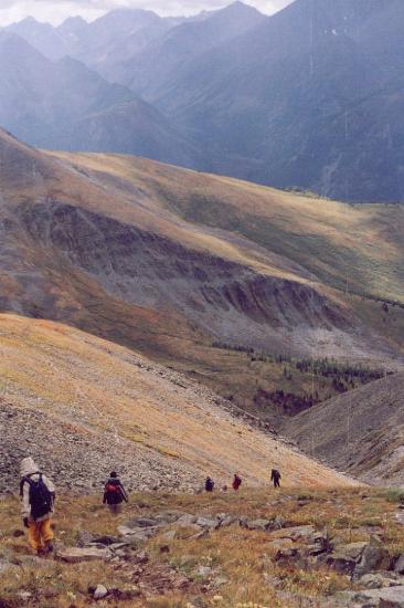 Vandaag verlaten we het kamp. Dus iets vroeger opstaan om de tenten op te breken. Om 9u krijgen we rijstpap en een soort oliebol geserveerd. Tegen 10u vertrekken we richting meer, en aan het meteorologisch station beginnen we aan de klim naar de Каратюрек [Karatiurek = "zwart hart"] -- 3070m. Het eerste deel van de klim gaat nog door het bos, natuurlijk steil omhoog. Daarna volgt een stuk door weiden, waar het iets minder steil is. Op regelmatige tijdstippen wordt er gerust (zodat de groep ook samenblijft). En omdat short-cuts niet altijd op short-cuts lijken geraakt de groep even in twee gesplitst.