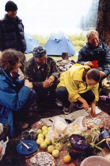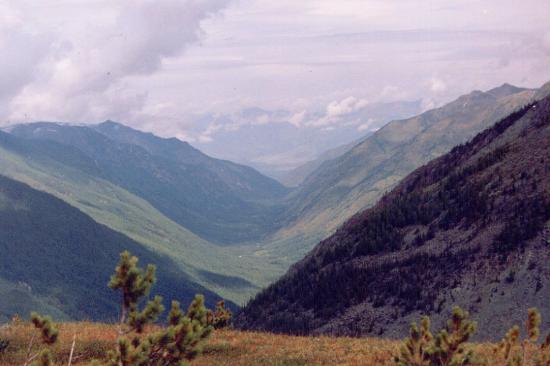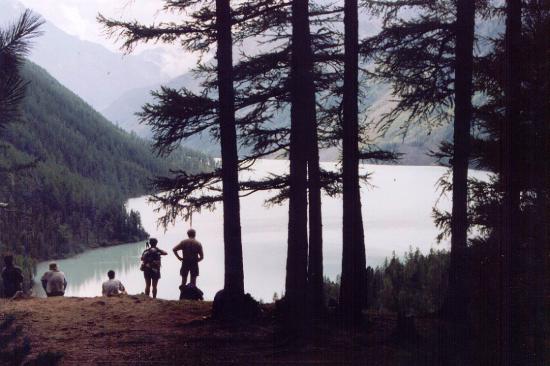 We zijn weer op trek: om 7u30 opstaan en tenten opbreken. Tegen 9u is de griesmeelpap klaar, en om 10u zijn we weg. Voor de eerste maal krijgen we een zicht op de Кучерла [Kucherla]-vallei. Helemaal in het zuiden kunnen we zelfs de Катунь [Katun]-vallei zien liggen, maar vandaag wandelen wij nog naar het noorden, naar het Кучерла [Kucherla]-meer. Tussen de bomen door zien we af en toe een deel van het meer.